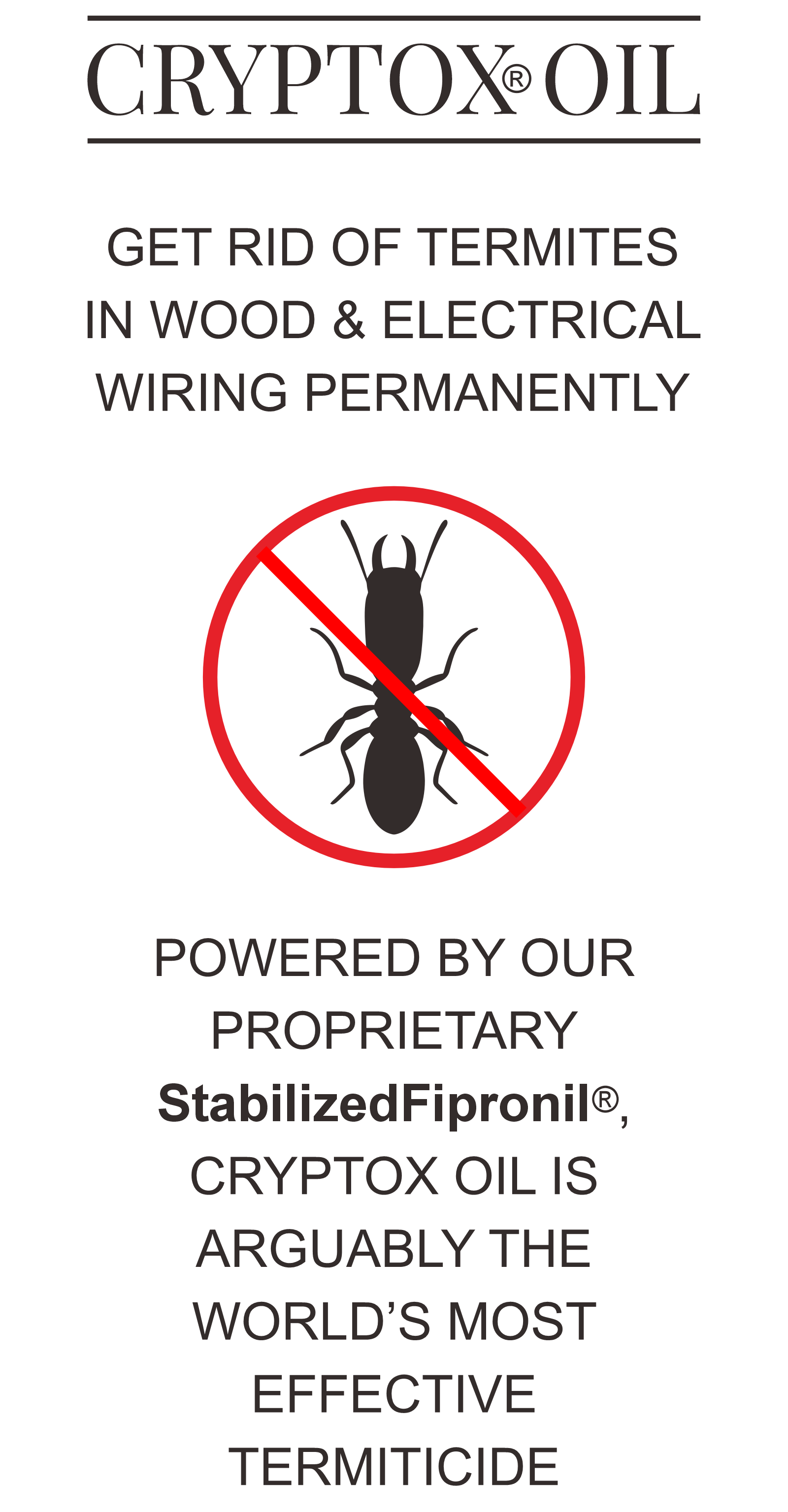 CRYPTOX OIL is the only termiticide specifically engineered to penetrate deeply through termite exit holes, wood grain, and wood pores within days or weeks. It kills termites on contact and provides permanent protection under treated conditions, preventing reinfestation.